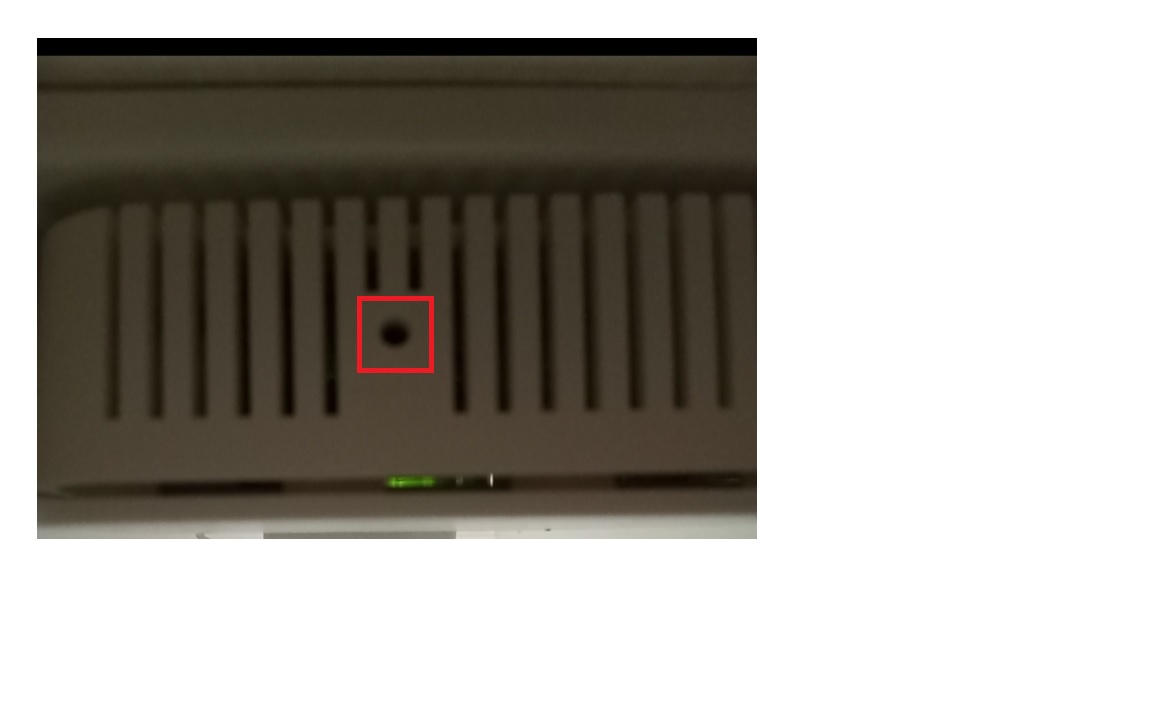 - Under själva fiberkonverteraren, den delen som blev utbytt till höger så måste du ta tex en säkerhetsnål och trycka in den knappen du ser på bilden under i ca: 10 sekunder tills alla lamporna på fronten slocknar, och då ta bort säkerhetsnålen. Mitt tips för att hitta detta hål är att ta kameran på mobiltelefonen som om du skulle ta en bild på dig själv, och lokalisera hålet.